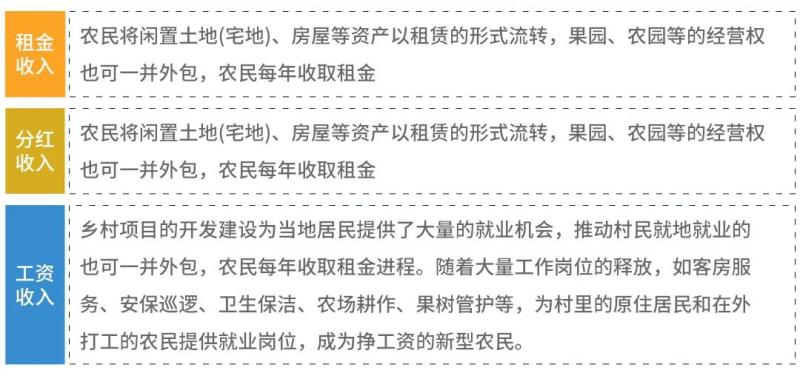 b) 農(nóng)民——租金、分紅、工資等收入 鄉(xiāng)村項目中,農(nóng)民是最直接的受益者。其收入來源主要分為三部分,即租金收入、分紅收入及工資收入