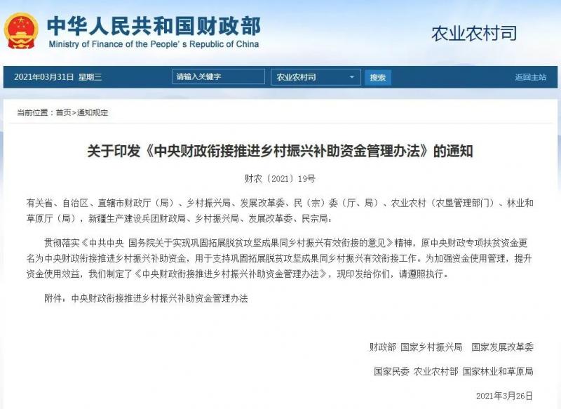 第八條 本辦法自2021年3月31日起施行,由財政部會同行業主管部門負責解釋。《財政部 扶貧辦 國家發改委 國家民委 農業部 林業局關于印發<中央財政專項扶貧資金管理辦法>的通知》(財農〔2017〕8號)和《財政部 國家林業局關于印發<國有貧困林場扶貧資金管理辦法>的通知》(財農〔2005〕104號)、《財政部 國務院扶貧辦關于印發<“三西”農業建設專項補助資金使用管理辦法(修訂稿)>的通知》(財農〔2006〕356號)、《財政部 國家民委關于印發<少數民族發展資金管理辦法>的通知》(財農〔2006〕18號)、《財政部 農業部關于印發<國有貧困農場財政扶貧資金管理暫行辦法>的通知》(財農〔2007〕347號)同時廢止。