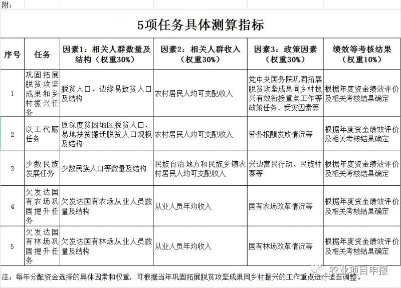 第二條 銜接資金按照鞏固拓展脫貧攻堅成果和鄉村振興、以工代賑、少數民族發展、欠發達國有農場鞏固提升、欠發達國有林場鞏固提升、“三西”農業建設任務進行分配。資金分配按照因素法進行測算,因素和權重為:相關人群數量及結構30%、相關人群收入30%、政策因素30%、績效等考核結果10%,并進行綜合平衡。各項任務按照上述因素分別確定具體測算指標(詳見附件)。“三西”農業建設任務按照國務院批準的規模安排。