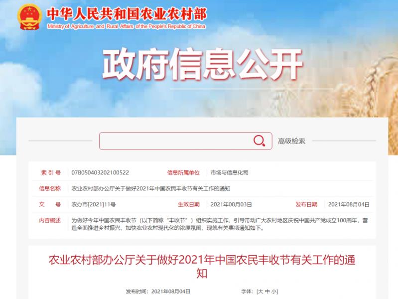農業農村部辦公廳關于做好2021年中國農民豐收節有關工作的通知