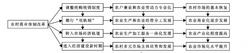 《中共中央關于農業和農村工作若干重大問題的決定》明確了以家庭承包經營為基礎、適應發展社會主義市場經濟要求的農村經濟體制改革目標,農產品市場基本放開,形成了以批發市場為核心、期貨市場為補充、城鄉集貿市場為基礎的農產品市場體系;貿工農一體化組織和供銷社加快發展,農業社會化服務體系建設持續增強,農民組織化程度不斷提高;批發市場、農資市場、流通主體、食品安全等法律法規出臺,規范化農村流通管理逐步形成;糧食、棉花、農資市場宏觀調控由直接轉向間接,市場化進程加快推進。