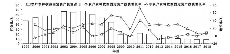 從圖2可知,我國農戶農林牧漁業固定資產投資占比從1999年的47.62%上升至2005年的67.85%而后呈現下降趨勢,并降至2018年的9.1%;同時從2003年開始,非農戶農林牧漁固定資產投資增長率一直高于農戶,說明農戶農業投資的增長潛力有限,非農戶已然成為農業投資的主力。