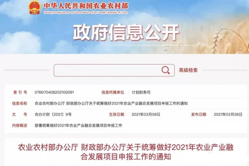 農(nóng)業(yè)農(nóng)村部辦公廳 財(cái)政部辦公廳關(guān)于統(tǒng)籌做好2021年農(nóng)業(yè)產(chǎn)業(yè)融合發(fā)展項(xiàng)目申報(bào)工作的通知