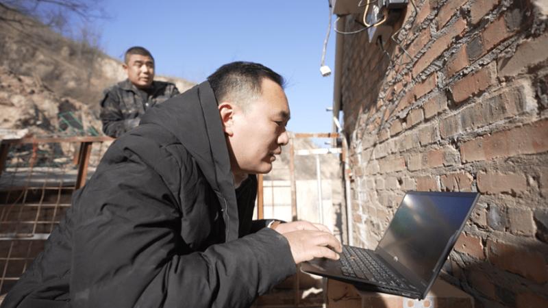 阿里巴巴員工在陜西清澗縣教農民用物聯網技術輔助土豬養殖。