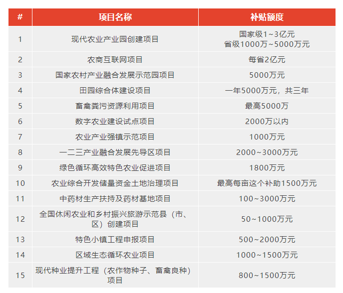 3)農業一二三產業融合發展先導區項目:2021年農業農村部將認定一批“農村一二三產業融合發展先導區”,重點支持并打造以資源聚集區和物流節點為重點,培育“生產、流通、物流、體驗、品牌、電商”于一體的產業集群。