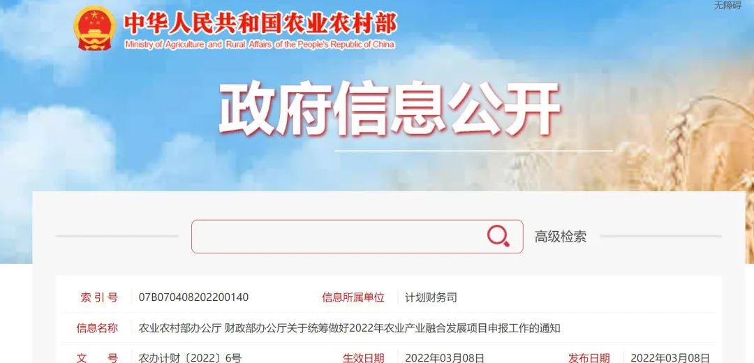 3月7日,農業農村部辦公廳、財政部辦公廳印發《關于統籌做好2022年農業產業融合發展項目申報工作的通知》(下稱《通知》)。