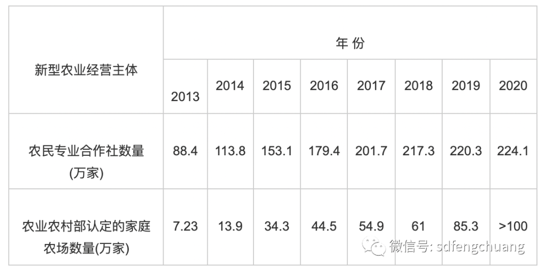 新中國成立70多年來,我國產業扶貧依次經歷了基礎夯實、起步探索、雛形確立、加速推進、精準施策五個階段[15]。產業扶貧的前四個階段,在政府主導下,依靠政府掌握的經濟資源,對鄉村產業發展起到積極作用,但在產業扶貧第五階段,市場機制逐漸趨于成熟,因而政府選定產業項目時愈發重視市場在農村經濟活動中的決定作用和龍頭企業對農戶發展的帶動作用,全面推進龍頭企業與合作社帶農工程。作為產業發展領頭軍的龍頭企業和具有天然益貧性的農民合作社憑借較高的技術、資金、管理、抗風險與對市場的把控能力,在“政府 龍頭企業 農戶”與“政府 合作社 農戶”模式下,通過現代農業生產經營體系的基本構建成功帶動了一大批群眾就業。2013—2020年間,全國農民專業合作社數量從88.4萬家增加到224.1萬家,農業農村部認定的家庭農場數量從7.23萬家增加到100萬余家(見表1)。截至2020年12月,全國832個已摘帽貧困縣的縣級以上帶貧龍頭企業達1.44萬家,平均每縣17家,農民合作社數量達到71.9萬家,平均每縣864家,72.6%的脫貧戶與新型農業經營主體建立了緊密利益聯結關系6。新型農業經營主體的增加,成功地帶動更多集社員、經營者與股東身份于一體的農戶脫貧致富。同時,龍頭企業、高校、金融機構等多方社會組織力量融入農村,推動城市要素與鄉村要素的集聚、共生,逐漸激發產業振興主體活力。鄉村產業帶動主體逐漸從政府主導改變為市場主導、企業帶動,社會組織力量參與并重,實現小生產與大市場的精準對接。
