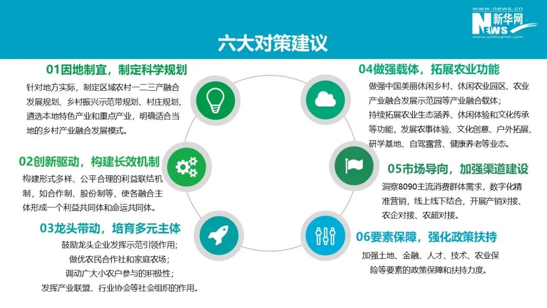 報(bào)告里提出了六大對(duì)策建議:第一,因地制宜,制定科學(xué)規(guī)劃;第二,創(chuàng)新驅(qū)動(dòng),構(gòu)建長(zhǎng)效機(jī)制;第三,龍頭帶動(dòng),培育多元主體;第四,做強(qiáng)載體,拓展農(nóng)業(yè)功能;第五,市場(chǎng)導(dǎo)向,加強(qiáng)渠道建設(shè);第六,要素保障,強(qiáng)化政策扶持。