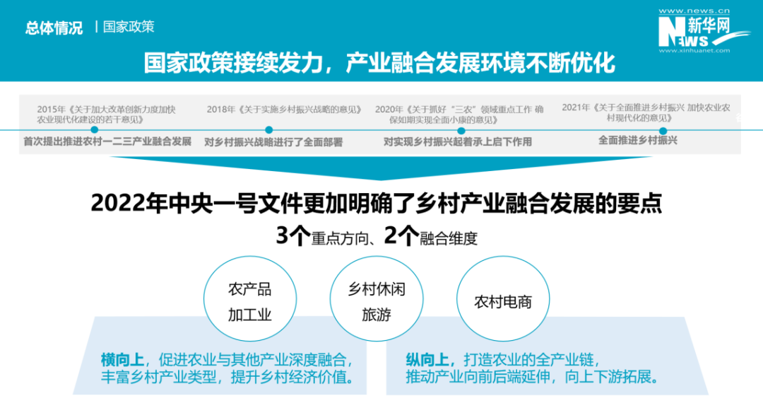 從總體情況來(lái)看:國(guó)家政策持續(xù)發(fā)力,產(chǎn)業(yè)融合發(fā)展的環(huán)境不斷優(yōu)化。2022年中央一號(hào)文件更加明確了鄉(xiāng)村產(chǎn)業(yè)融合發(fā)展的三個(gè)重點(diǎn)方向和兩個(gè)融合緯度。全國(guó)鄉(xiāng)村產(chǎn)業(yè)融合發(fā)展勢(shì)頭良好,產(chǎn)業(yè)規(guī)模初具,農(nóng)業(yè)產(chǎn)業(yè)鏈條和多種功能不斷延伸延展,產(chǎn)業(yè)融合主體規(guī)模不斷壯大。