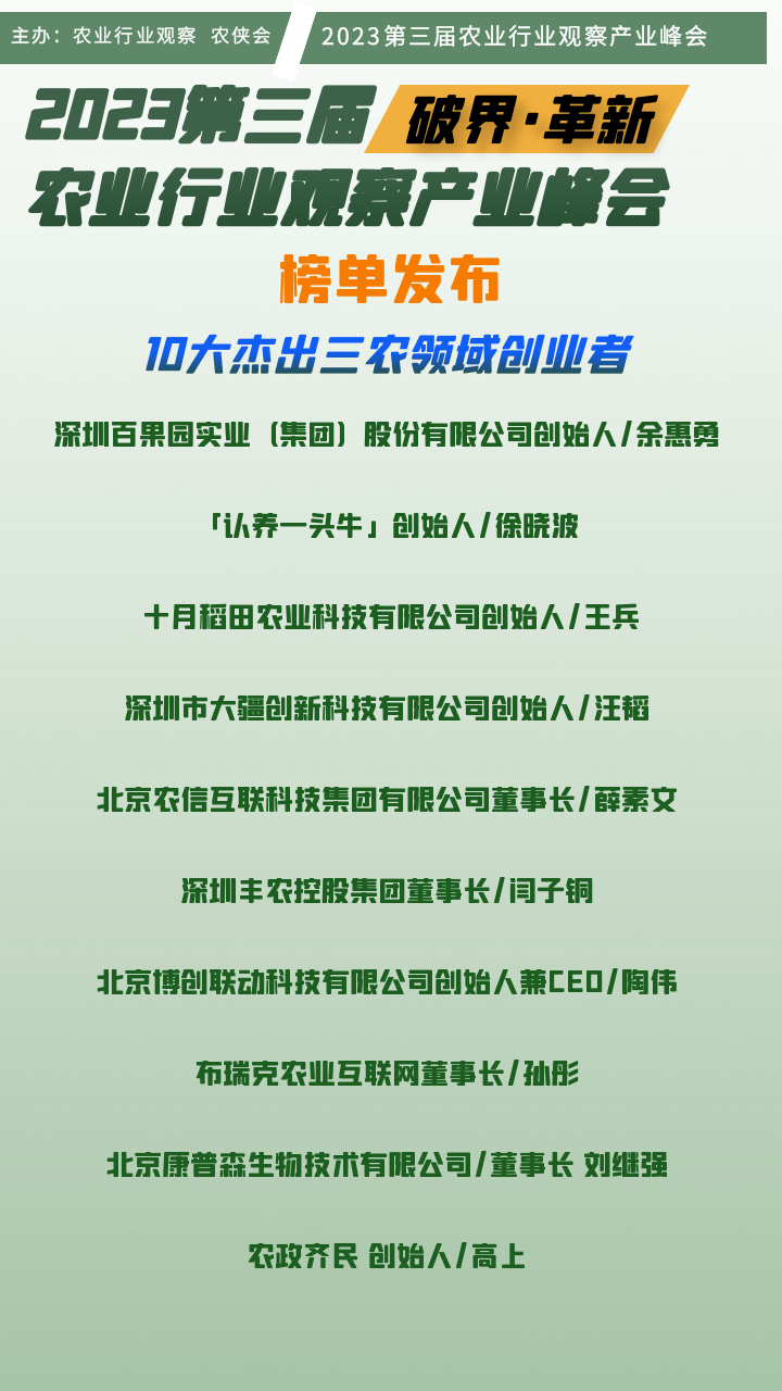 以下,附上各類行業(yè)榜單,恭喜各位上榜,也感謝各位企業(yè)、創(chuàng)業(yè)者、專家對農(nóng)業(yè)行業(yè)、鄉(xiāng)村振興作出的貢獻與成績。