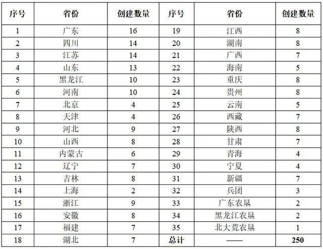 其中,創建數量超過10個的有廣東省、江蘇省、四川省、山東省、黑龍江省、河南省4 個省份(如表1),超過 5個(不包含5個)的有河北省、山西省、吉林省、遼寧省、浙江省、安徽省、江西省、湖南省、廣西壯族自治區、重慶市、貴州省、西藏自治區、陜西省等 18個省份。其中,2019年和2020年,將廣東省、江蘇省、山東省、四川省4個省的12個省級產業園納入國家產業園管理體系。