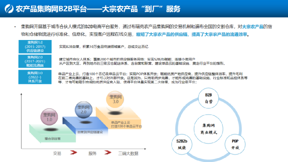 兩個平臺我簡單再介紹一下,第一個是集購網B2B平臺,簡單來講提供的是對農產品加工行業、食品飲料加工行業大宗農產品到場的服務,解決農產品供應鏈效率的問題,從大宗農產品交易標準化、信息化到訂單數字化到供應鏈交付的數字化。打通這些流程,我們經過了六七年的時間嘗試。