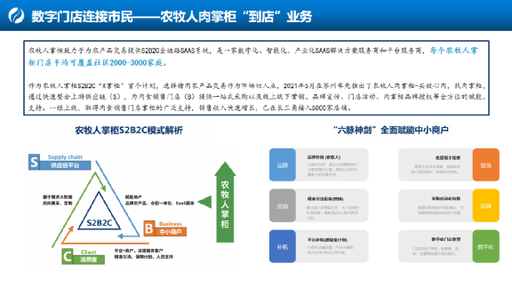 第二個平臺就是農牧人商城。再到城市端毛細血管是農牧人在做的事情,農牧人在農批市場下游就是農貿市場,一是社區里打造了數字門店體系,它是一套SaaS化的系統,能夠讓農貿市場檔口直接接入進來,我們合作之后一是幫助它形成數字化門店管理;二是做了終端、末端,就是社區里集單體系。農貿市場里每天銷售由我們進行集采批發,給他配送到店。