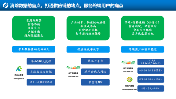 與此同時,圍繞著數據和全產業鏈,農業大數據+產業互聯網,布瑞克到底想解決農業什么問題呢?我們總結出來三個點,一是消除數據的盲點,二是打通供應鏈的堵點,三是服務終端用戶痛點。下面,我再剖析一下: