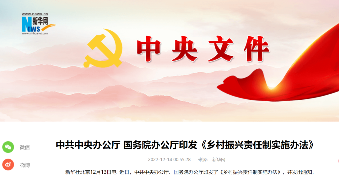 近日,中共中央辦公廳、國(guó)務(wù)院辦公廳印發(fā)了《鄉(xiāng)村振興責(zé)任制實(shí)施辦法》,并發(fā)出通知,要求各地區(qū)各部門認(rèn)真遵照?qǐng)?zhí)行。