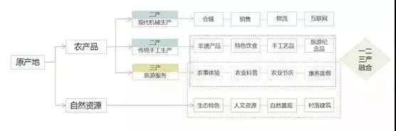 以“原產地特色+原材料加工”的消費驅動模式,推進一二三產業融合發展,主要由一產帶動二產和三產發展,實現特色農產品→加工→服務體驗(旅游觀光、休閑及度假、互聯網應用、物流倉儲、銷售等)的全產業鏈發展模式。