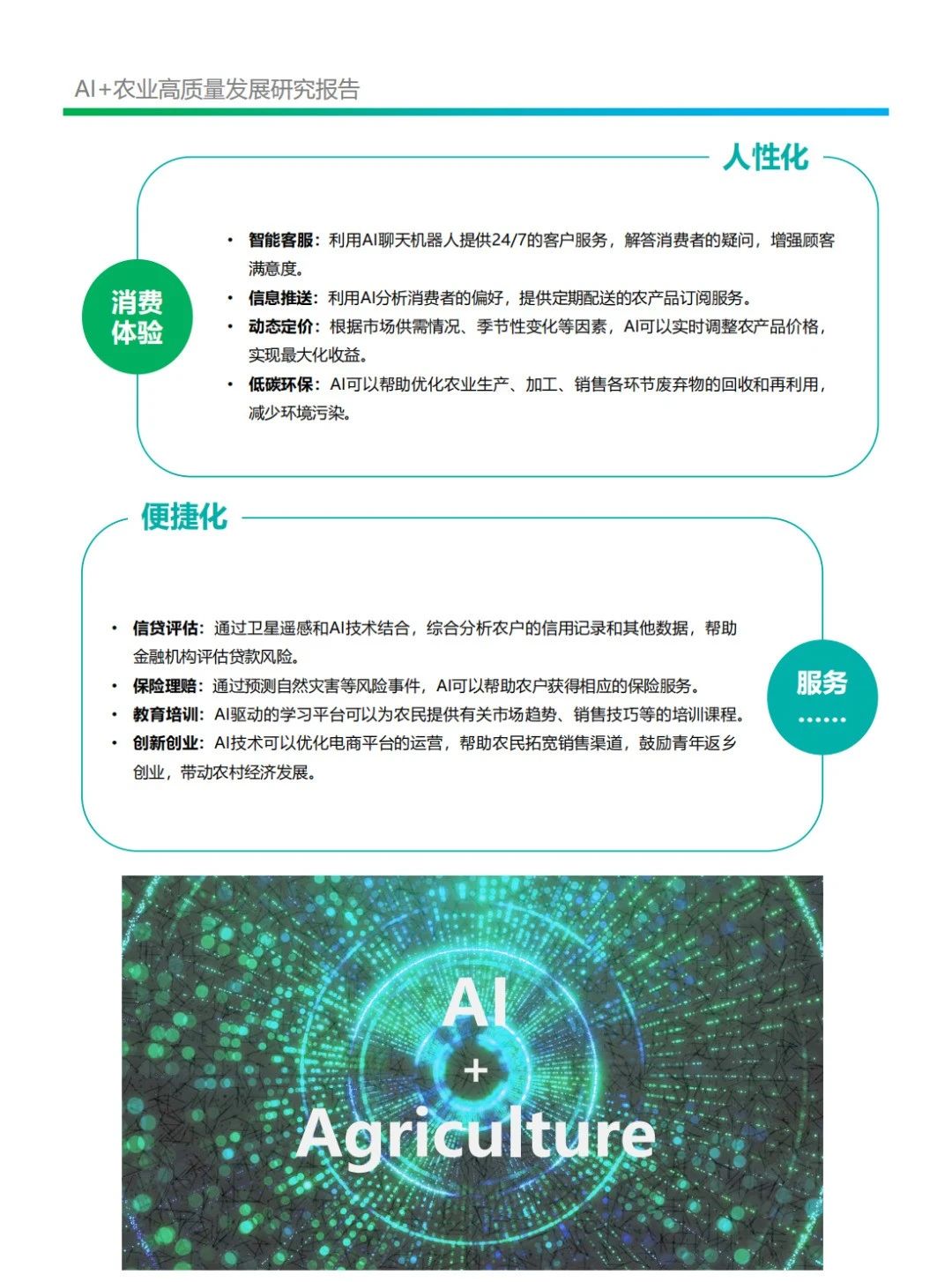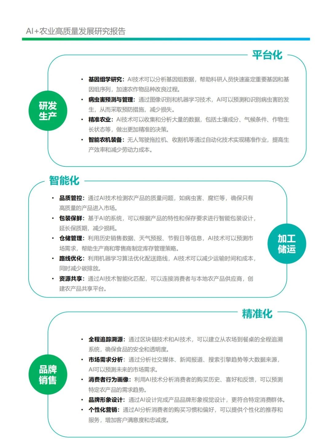 當前,新一輪科技革命和產(chǎn)業(yè)變革蓬勃興起,以AI為代表的新一代信息技術(shù)加速創(chuàng)新,正在以前所未有的速度,全方位融入經(jīng)濟社會發(fā)展的各個領(lǐng)域,為中國式現(xiàn)代化注入新動能。以農(nóng)業(yè)為例,AI的應(yīng)用可以帶來研發(fā)生產(chǎn)平臺化、加工儲運智能化、品牌銷售精準化、消費體驗人性化、服務(wù)創(chuàng)新便捷化等新機遇,極大提高農(nóng)業(yè)生產(chǎn)力水平,提升農(nóng)產(chǎn)品市場效益和消費者福利,促進農(nóng)業(yè)高質(zhì)量發(fā)展。