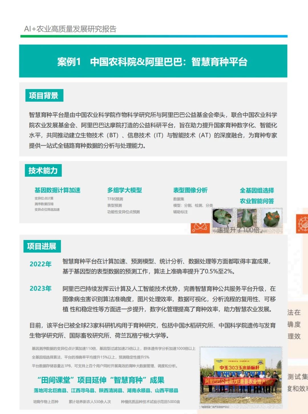 我們欣喜地看到,越來越多的農(nóng)業(yè)企業(yè)、數(shù)字科技平臺、高等院校、科研院所積極擁抱數(shù)字技術(shù),加大AI技術(shù)在智慧育種、數(shù)字生產(chǎn)、數(shù)字營銷、農(nóng)業(yè)基礎(chǔ)設(shè)備、質(zhì)量安全、人才培養(yǎng)等領(lǐng)域的應(yīng)用,呈現(xiàn)出遍地開花的良好態(tài)勢。比如,在育種環(huán)節(jié),中國農(nóng)科院、阿里巴巴公益、達摩院共同打造智慧育種平臺,服務(wù)全球23家科研機構(gòu),提高育種效率。再比如,在種植環(huán)節(jié),中化現(xiàn)代農(nóng)業(yè)搭建“MAP智農(nóng)”數(shù)字農(nóng)業(yè)平臺,為種植者提供科學(xué)的生產(chǎn)服務(wù)和精準的農(nóng)事指導(dǎo),服務(wù)250萬農(nóng)戶,覆蓋活躍面積超1億畝。此外,在數(shù)字營銷環(huán)節(jié),淘天集團開發(fā)電商行業(yè)大模型,覆蓋從商家經(jīng)營到消費者體驗全流程,提升商家運營效率。