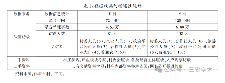 本文數據收集主要采用半結構式訪談方法,輔以隨機抽樣問卷調查及內部文檔、公開報道資料歸納整理。課題組于2017年1月赴G省典型案例村莊開展集中調研,篩選并鎖定D村和S村進行長期蹲點調查。2017~2023年,課題組多次回訪G省兩個典型案例村莊。在具體半結構式訪談中,課題組首先對村委會管理人員、各類新型農業經營主體、其他相關人員展開系統訪談。訪談內容包括村莊發展歷程、村莊要素重組情況、村莊組織治理結構、政府等外部主體在村莊發展中的作用、關鍵人物的特征及作用、有無負面沖突事件及其處理方式、受訪者個人經歷及其參與村莊發展過程等。在此基礎上,本文圍繞村莊基本情況、村民信任、社會參與、發展認同與支持、現存問題等設計了農戶調查問卷,并以隨機抽樣方式對案例村莊農戶展開問卷調查,查閱整理村莊內部文檔、網上公開報道等資料(見表 1)。