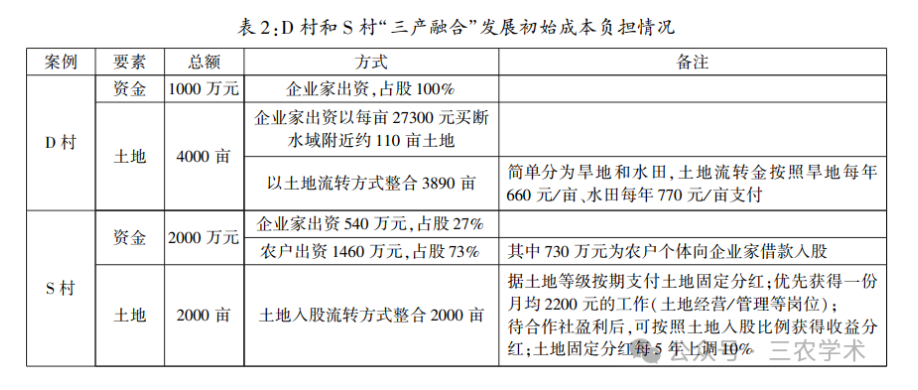 農村“三產融合”發展過程啟動離不開資本、土地等要素整合投入,其中,資本要素最為稀缺。成本負擔,作為發展過程啟動的基礎,旨在解決發展資源、資金從哪來的問題。D村和S村啟動“三產融合”發展過程均源于精英帶領,經歷了資本進村、土地整理過程。案例村莊兩位精英帶頭人均利用自身資本積累和社會網絡資源為村莊發展帶來了機遇。但從兩村初始成本投入結構來看,不同實踐路徑之間的差異明顯。以D村為代表的項目式發展路徑在啟動發展時基本采用了外部轉嫁的成本負擔方式。村莊發展所需的1000萬元初始發展資金均由外來企業家支付,村莊發展初始資本投資結構單一。同時,D村在整合土地資源過程中,一方面通過外來資本買斷方式獲取土地資源;另一方面在流轉農戶土地資源時完全按照集中連片原則強勢流轉,未考慮農戶未來生計問題。