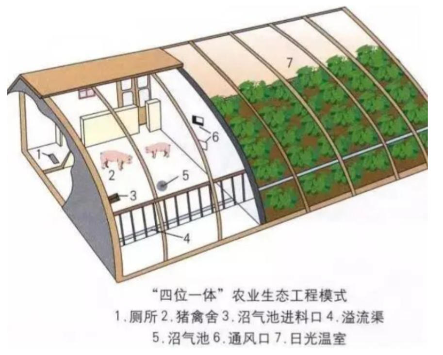 “四位一體”生態模式是在自然調控與人工調控相結合條件下,利用可再生能源(沼氣、太陽能)、保護地栽培(大棚蔬菜)、日光溫室養豬及廁所等4個因子,通過合理配置形成以太陽能、沼氣為能源,以沼渣、沼液為肥源,實現種植業(蔬菜)、養殖業(豬、雞)相結合的能流、物流良性循環系統,這是一種資源高效利用,綜合效益明顯的生態農業模式。