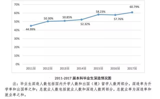 對此,記者在2017年的就業質量報告中,找到了中國農業大學官方披露的2011-2017屆本科畢業生深造情況圖表,在這份統計里,學校把國內外升學人數做了統一計算、對比。從圖中觀察,2011屆本科畢業生升學率為44.99%,而到了2017屆時,本科畢業生的升學率迅速竄升至60.79%,并存在逐年上升趨勢。