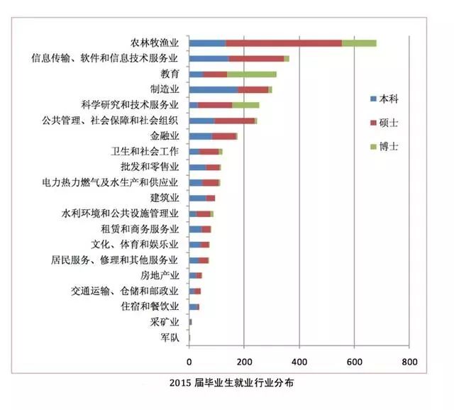 與此同時,記者在中國農業大學的官網上找到一份《中國農業大學2018年畢業生就業質量報告》,依照國家統計局行業分類標準,中國農業大學 2018 屆畢業生就業行業前三位分別為農林牧漁業,教育,公共管理、社會保障和社會組織。農林牧漁業作為中農大的傳統就業方向,2018屆5144位畢業生里有超過400位投入其中進行擇業。而2017年,具體數據沒有標注。而同一網站上,2016年的數據報告則表明,當屆有近500位畢業生選擇農林牧漁業進行就業。再把目光跳回2015年時,當屆選擇同一領域的畢業生則逼近700人。