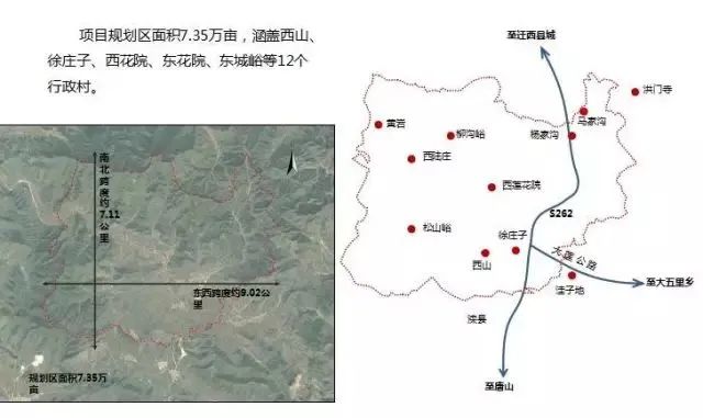 試點項目所在地東蓮花院鄉地處遷西、遷安、灤縣、豐潤四縣交界處,距京沈高速20公里,距遷西縣城30公里,距在建的京秦高速僅僅5分鐘車程,位于環首都2小時經濟圈內,區位和交通優勢明顯。項目規劃區總面積7.35萬畝,涵蓋西山、徐莊子、西花院、東花院、東城峪等12個行政村。項目總投資17.2億元,建設期為三年,總計可獲財政資金支持2.1億元,同時可撬動社會資本10億元。