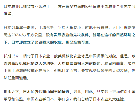 相比高度機械化的歐美農業,日本農業在某種程度上更值得中國農業學習。總結了日本農業最重要的九大經驗,以供借鑒。