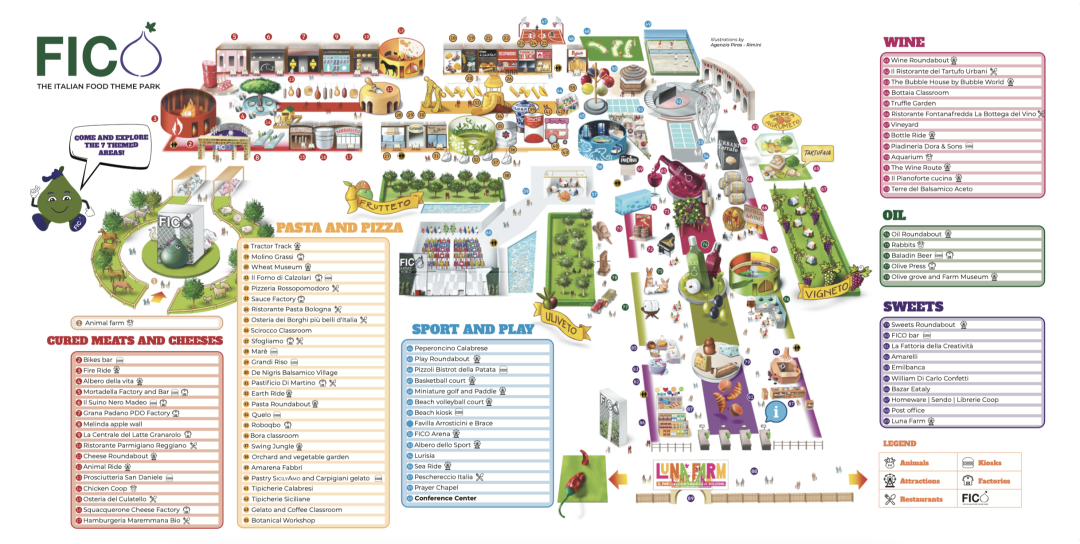 FICO Eataly World(以下簡稱為 FICO )共設置了8大主題體驗區,分別是:熏肉和奶酪區、意大利面和披薩區、葡萄酒區、食用油區、糖果甜點區,外加動物農場區、運動游玩區,以及一個兒童游樂園 Luna Farm。