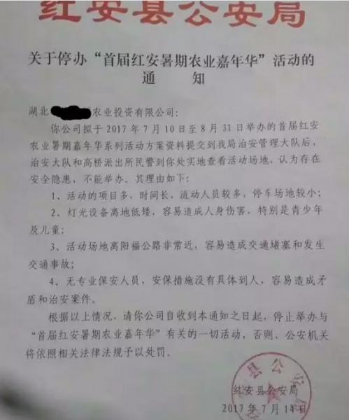 7月中旬,湖北省紅安縣某農(nóng)場(chǎng)的農(nóng)場(chǎng)主老李攤上大事兒了。縣公安局出臺(tái)紅頭文件,叫停了他籌備已久、已投入數(shù)十萬(wàn)的農(nóng)業(yè)嘉年華活動(dòng)(實(shí)際上就是夜間燈光秀)。