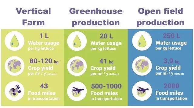 同樣面積的垂直農(nóng)場(chǎng)、大棚、露天農(nóng)田的耗水量、產(chǎn)出和運(yùn)輸距離