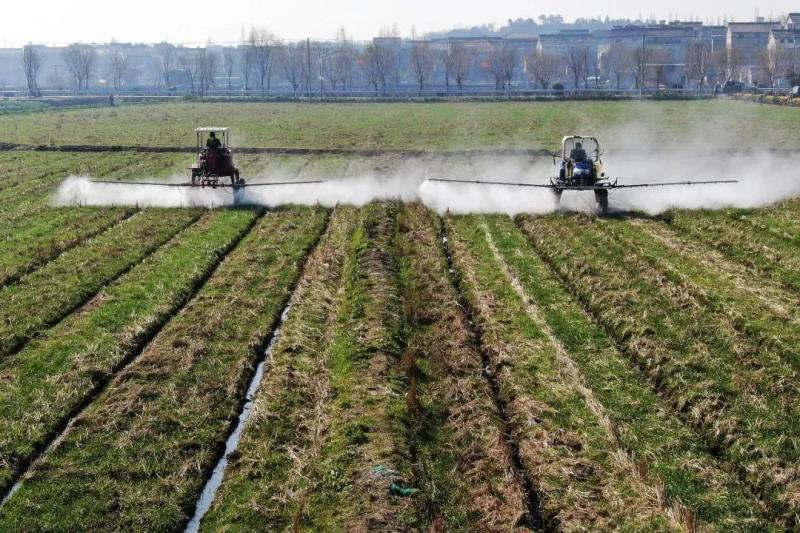 2020年2月20日,南京湖熟街道現代農業示范園區內,工作人員駕駛自走式噴霧機給小麥噴灑除草劑。