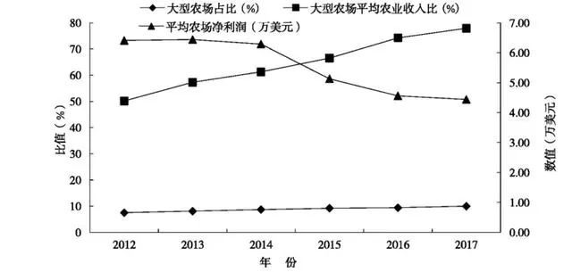 如圖1所示,2012—2017年,美國(guó)農(nóng)場(chǎng)平均凈利潤(rùn)從2012年的6.41萬美元降至2017年的4.44萬美元,但大型農(nóng)場(chǎng)(年銷售額超過35萬美元)平均農(nóng)業(yè)收入比以急速增長(zhǎng)模式增長(zhǎng),從2012年的50.12%上漲至2017年的77.89%,大型農(nóng)場(chǎng)占比也呈上漲態(tài)勢(shì),充分表明大型農(nóng)場(chǎng)的平均凈利潤(rùn)增速相對(duì)較快,這也說明美國(guó)農(nóng)業(yè)的企業(yè)化發(fā)展提高了美國(guó)農(nóng)業(yè)的效益和效率。
