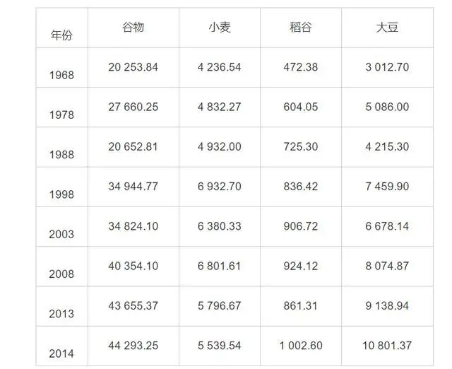 由于農(nóng)業(yè)科技的進(jìn)步,谷物、小麥、稻谷和大豆等主要農(nóng)作物產(chǎn)量顯著增加,如表2所示。