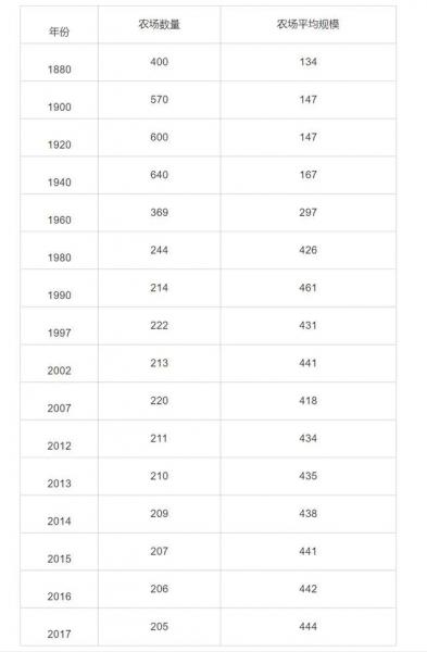 19世紀(jì)80年代至20世紀(jì)初期的企業(yè)合并浪潮和壟斷企業(yè)的迅速發(fā)展雖然對(duì)家庭農(nóng)場(chǎng)的生存造成巨大的市場(chǎng)壓力,但農(nóng)場(chǎng)仍然具有生命力。至1910年,美國(guó)農(nóng)場(chǎng)總數(shù)為636.2萬個(gè),農(nóng)場(chǎng)土地面積總計(jì)52.68億畝(1畝=1/15hm2),平均每個(gè)農(nóng)場(chǎng)面積為828畝。在1920、1930和1940年,美國(guó)農(nóng)場(chǎng)總數(shù)分別為651.8萬個(gè)、654.6萬個(gè)和635.6萬個(gè)。1950年,農(nóng)場(chǎng)總數(shù)減少到564.8萬個(gè),以后則呈不斷減少趨勢(shì),1960和1970年,分別減少到396. 2萬個(gè)和292. 4萬個(gè),1979年是233.0萬個(gè)。