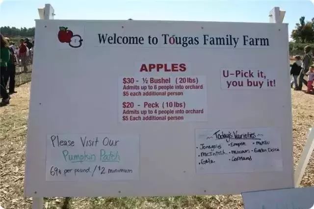 凡入園采摘者,均需要排隊(duì)購(gòu)買采摘袋,小袋20美元一個(gè),可以采摘約10磅蘋果,并最多進(jìn)園4人,大袋30美元一個(gè),可以采摘20磅蘋果,并最多可進(jìn)園6人。