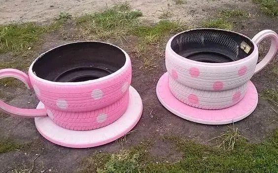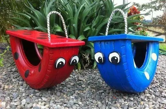 收集一些舊輪胎,涂上靚麗的顏色,給孩子們制造一些富有想象力的游樂設(shè)施。