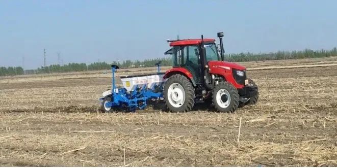無人拖拉機掛接電驅播種機,并集成高精度衛星定位系統、導航控制系統、精量播種控制系統、作業路徑規劃系統和網絡通信系統,實現主從機協作,完成無人播種作業。玉米無人播種作業場景如圖5所示。