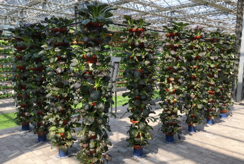 該栽培形式由數個花瓣狀栽培缽通過鋼管做立柱錯落疊放而成,