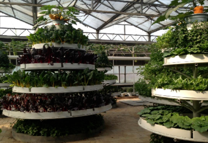 漏斗內的基質固定蔬菜,頂層的種植槽可以種植辣椒茄子等作物,