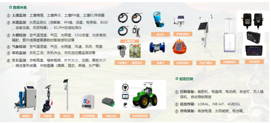 生產過程數據收集和控制的智能化設備,包括數據采集:育苗環境監測、氣象環境監測、土壤墑情監測、病蟲害監測、苗情監測;智能控制:智能灌溉、智能殺蟲、無人駕駛等。
