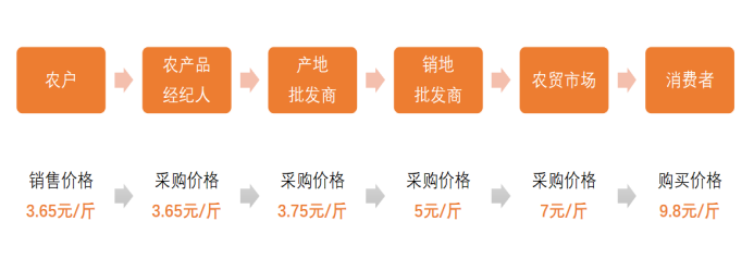 ④ 銷地批發商再將白菜運送到超市、餐館、學校等地方,終端渠道加上自己倉儲、物流、人工、包裝、門店租金、損耗等,5毛錢的白菜變成了8毛(數字不一定完全準確,不影響我們得出結論)。