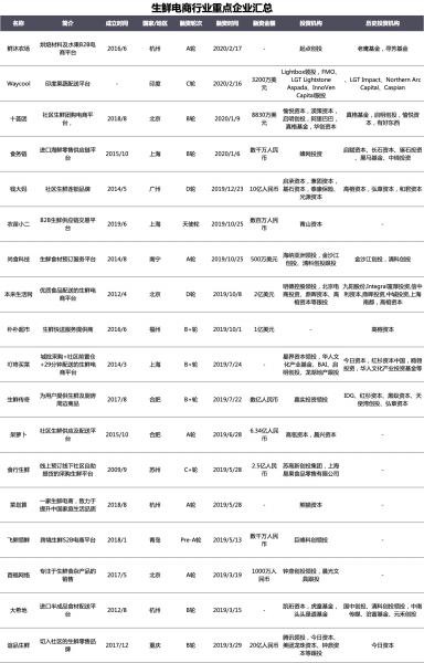 中國生鮮電商行業(yè)經(jīng)歷了多年的發(fā)展,前期大量中小型企業(yè)涌現(xiàn),除了巨頭布局不斷加碼外,也有部分初創(chuàng)企業(yè)持續(xù)拿到了融資。過去一年仍處于資本寒冬期,生鮮電商在創(chuàng)投領(lǐng)域中仍相對活躍,多家生鮮電商企業(yè)得到資本青睞,獲得大額融資。