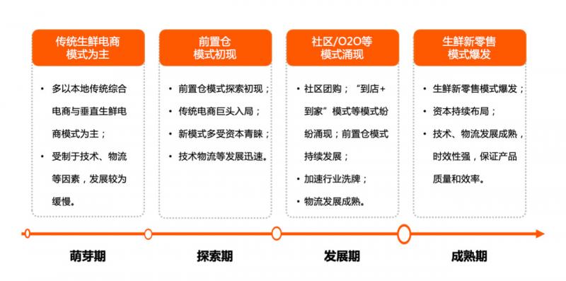 隨著以每日優(yōu)鮮為代表的前置倉模式企業(yè)的初現(xiàn),傳統(tǒng)電商巨頭相繼入局,同時,受資本青睞,生鮮電商也迎來了探索期。此后,隨著生鮮電商不斷發(fā)展,社區(qū)團(tuán)購模式,到店+到家等模式紛紛涌現(xiàn),前置倉模式逐漸成熟,同時革新了物流配送體系。