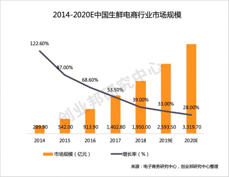2017年起,中國生鮮電商市場發(fā)展迅速,市場規(guī)模約為1402.8億元,并保持50%以上的增長率。2017-2018年市場迎來洗牌期,大量中小型生鮮電商或倒閉或被并購,市場遇冷。