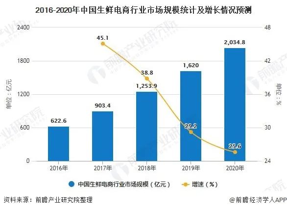 生鮮電商自出現以來,發展速度迅猛,都保持著30%以上的年增長率。2018年,生鮮電商的市場規模達到1253.9億元,同比增長38.8%。進入2019年,生鮮電商增長腳步放緩,市場經過前面的高速增長后開始進入冷靜期,市場規模約為1620億元,2020年預計仍然平穩增長,突破2000億元。