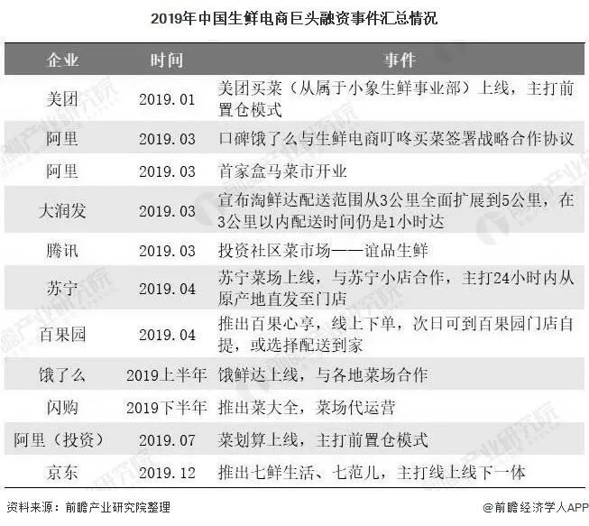 一邊是中小玩家一片死傷,一邊是巨頭戰略調整,開發新業態。2019年,生鮮電商新模式不斷涌現,阿里、騰訊、美團、京東都有布局。2019年上半年,美團買菜、盒馬菜市、餓了么買菜、蘇寧菜場相繼開業,叮咚買菜和樸樸超市則于同期相繼獲得新融資。下半年,閃購、京東和阿里紛紛布局。