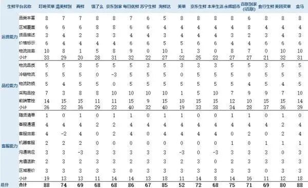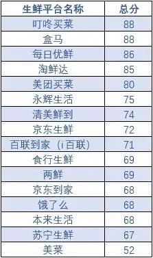 ?食行生鮮、兩鮮、京東到家、餓了么、本來生活、蘇寧生鮮、美菜等7家平臺則低于70分。
