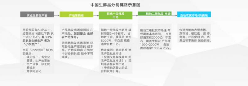 1、傳統(tǒng)分銷供應(yīng)鏈模式下,生產(chǎn)者與消費(fèi)者相隔多層分銷環(huán)節(jié):由于上游生產(chǎn)的時(shí)空分布不均,我國(guó)生鮮品目前需要依賴多級(jí)產(chǎn)銷地批發(fā)市場(chǎng)實(shí)現(xiàn)全國(guó)范圍內(nèi)的分銷流通。其中,產(chǎn)地采 購(gòu)商起到整合當(dāng)?shù)厣r農(nóng)產(chǎn)的作用,輻射范圍相對(duì)較小。而銷地批發(fā)市場(chǎng)通常交易規(guī)模較大,能夠輻射省級(jí)地理區(qū)域。各級(jí)批發(fā)市場(chǎng)的規(guī)模懸殊使得各環(huán)節(jié)的流通速率、儲(chǔ)存條件大相徑庭,而繁瑣的鏈條削弱了從業(yè)者的盈利能力,限制了從業(yè) 者改善前述經(jīng)營(yíng)條件的能力。同時(shí),由于生產(chǎn)者與消費(fèi)終端相隔多層分銷環(huán)節(jié),生產(chǎn)者通過(guò)提升品質(zhì)、建設(shè)品牌從而建立 終端競(jìng)爭(zhēng)力的能力也受到大幅限制。